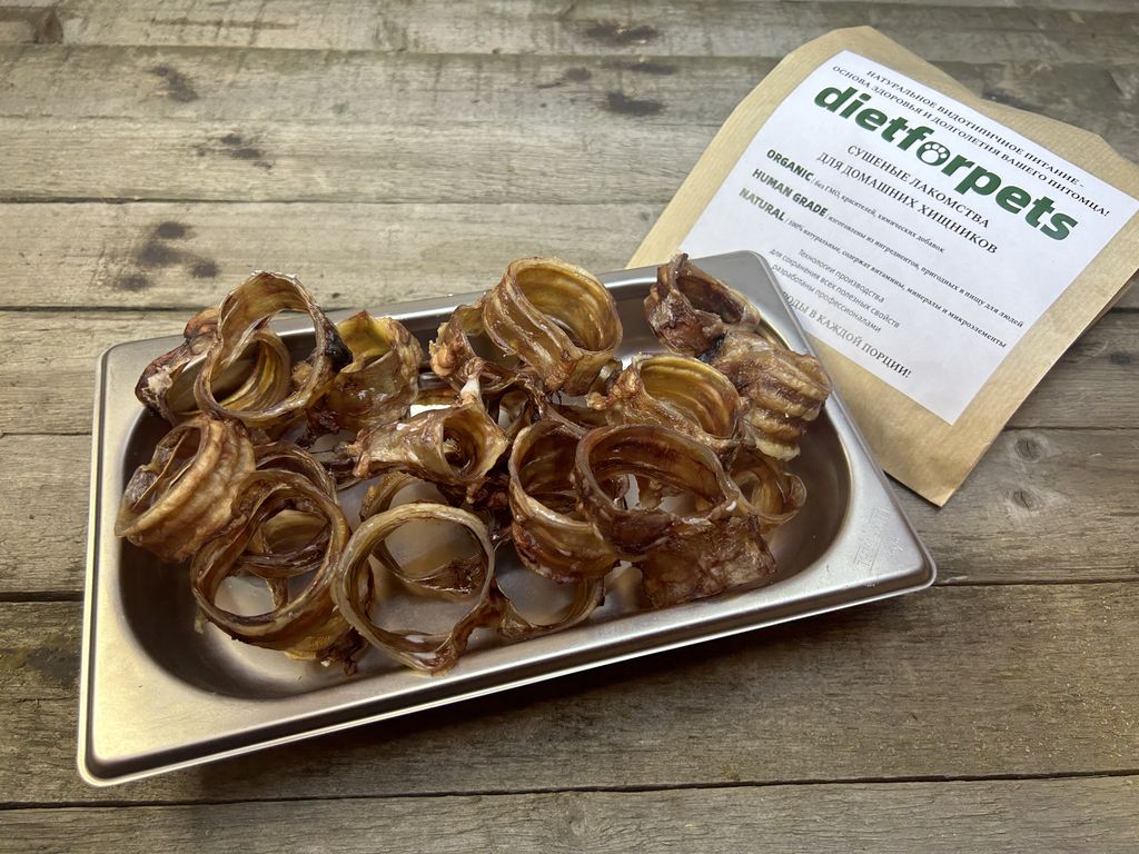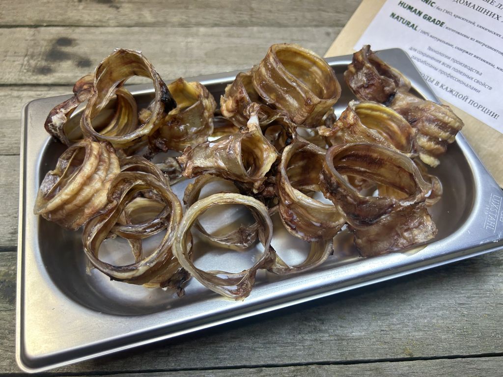 Трахея - это чистый хрящ, постный, очень ценный продукт в рационе собаки с самого молодого возраста. Трахея говяжья представляет собой полезные хрящевые составляющие, необходимые в рационе собаки для укрепления хрящевых тканей суставов и других костных частей тела.